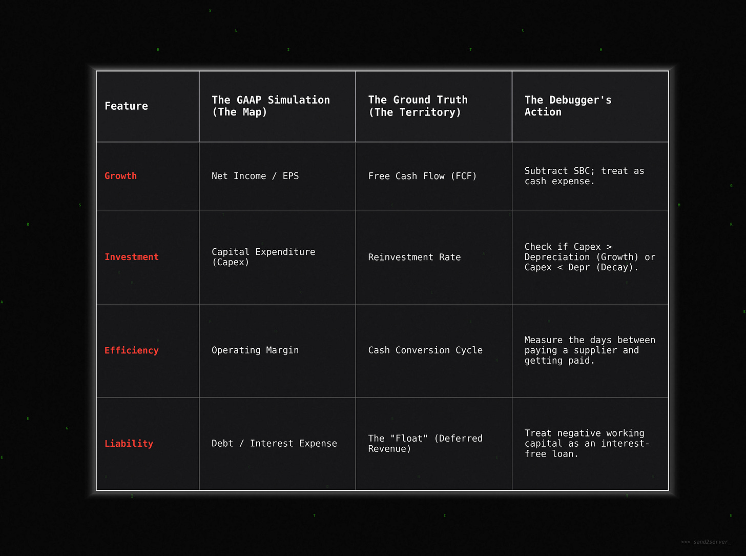 This is basically trying to decipher the simulation (GAAP) vs. reality (cash flow). The following matrix acts as the primary translation layer between accounting fiction (the map) and economic reality (the territory). By mapping distorted GAAP metrics like net income to their cash-based counterparts, we can expose the specific artifacts introduced by accrual accounting. The final column provides you with a functional set of "debugging instructions", basically a heuristic check that you can run against any public financial statement. This list is not exhaustive, but a teaser, which I’ll happily expand in future articles.