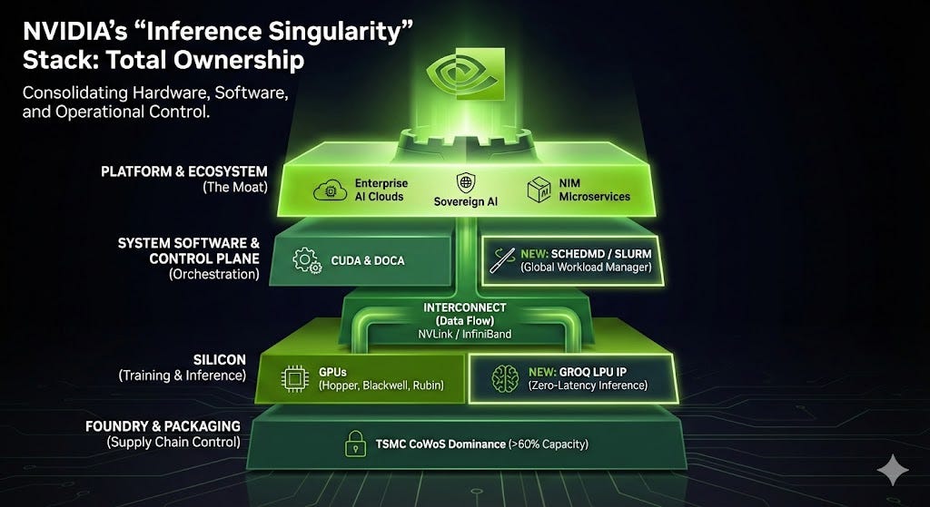 NVIDIA’s response (the deals) was to buy the components of that integrated system: SchedMD gave them the “Borg” equivalent (Slurm), and Groq gave them the specialized “inference” IP to protect their flank against cost-optimized TPUs.
