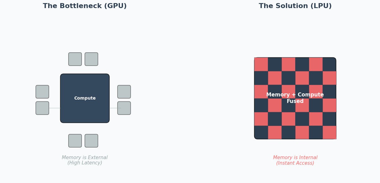 The GPU problem (probabilistic): GPUs (like the H100) are throughput engines. They rely on HBM (high bandwidth memory) to store massive models. But HBM is physically far from the compute cores. When a GPU generates text token-by-token, the compute cores often sit idle, waiting for data. This creates latency and wastes power—the “Memory Wall.”