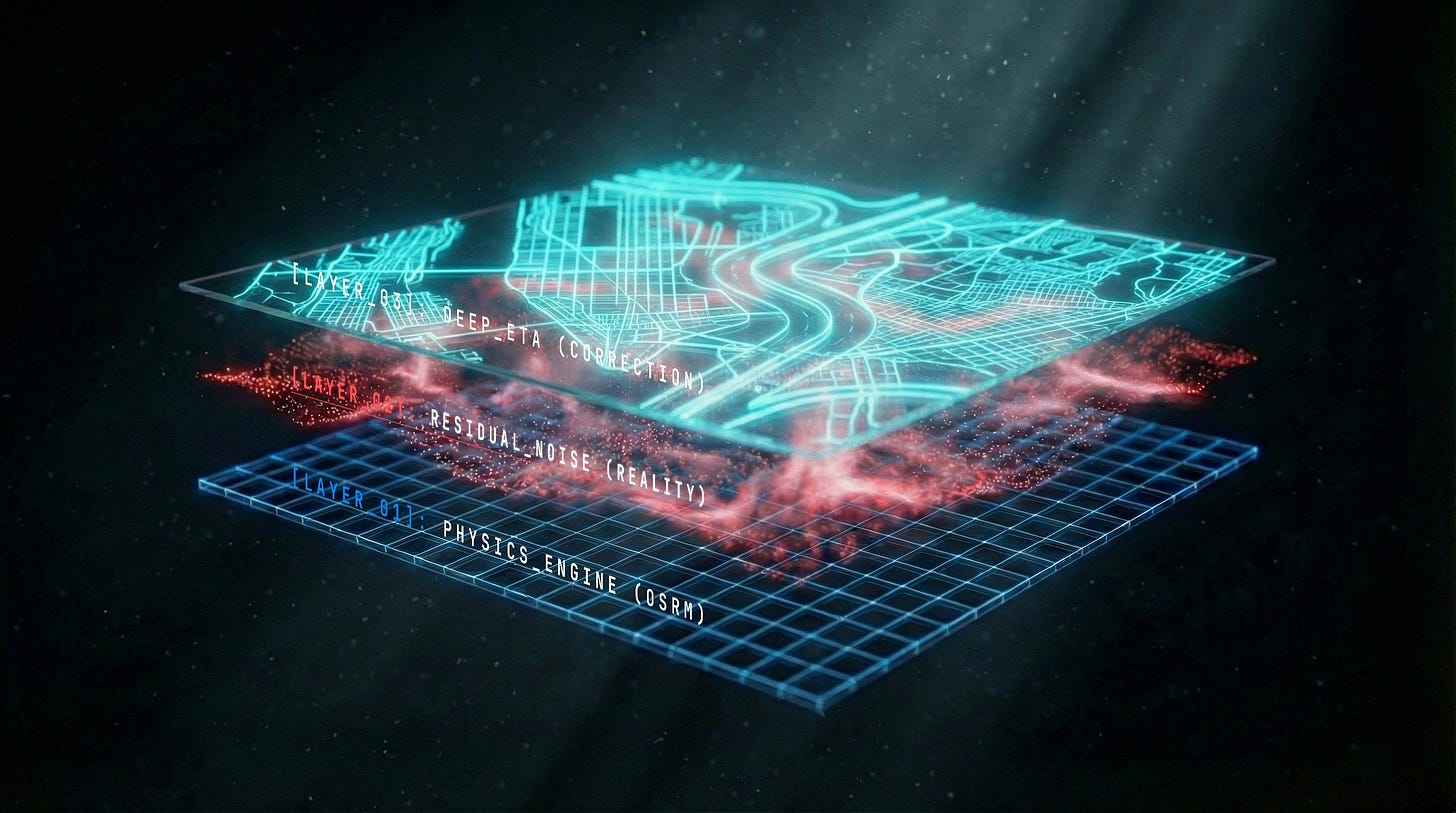 Uber’s DeepETA predicts the residual (the error) of that calculation based on context.