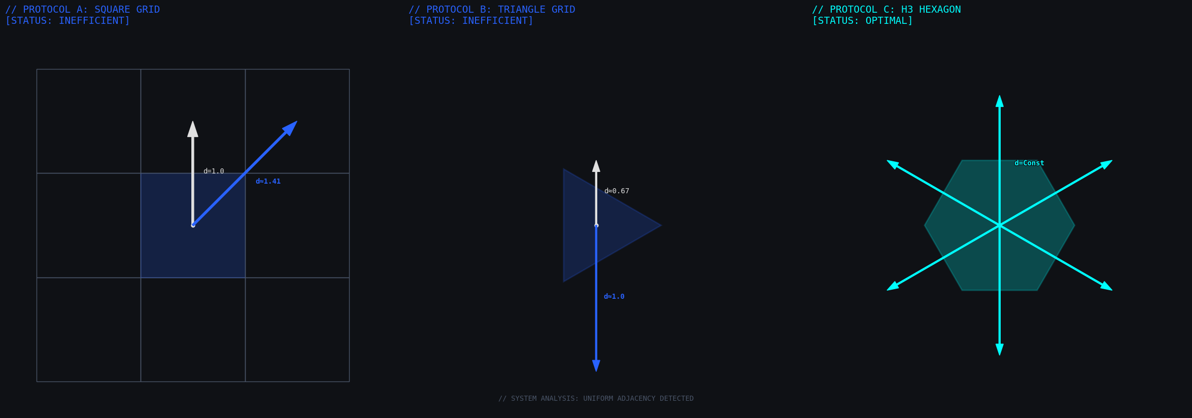 Why Hexagons? If you try to analyze a city using a square grid (like a chessboard), you run into the “diagonal neighbor” issue.