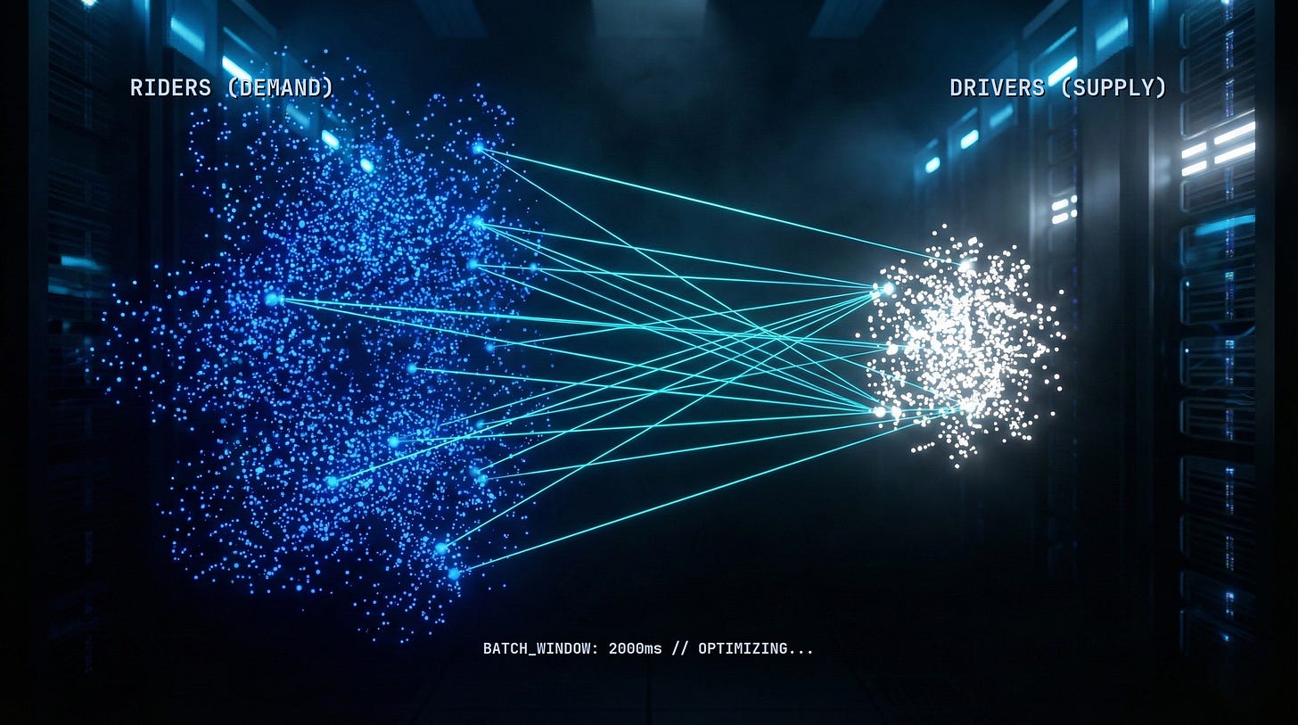 Every single one of those trips required a localized auction, a routing calculation, a fraud check, and a payment settlement - all happening in under 500 milliseconds. This is not “hailing a cab.” This is high-frequency trading applied to the movement of atoms.